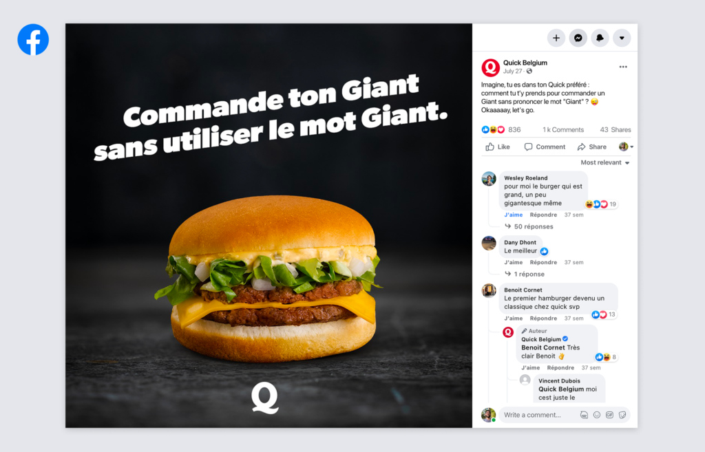 Idea: For Quick Belgium, between the ongoing content and campaigns, we made more engaging posts. Here, we asked the Quick community to share the best way to order the iconic Giant burger without using the word ‘Giant.’ Followers of the Quick page loved it and played along by posting +1.000 comments in FR and +1.200 comments in NL. Our community manager had a blast answering and connecting with the food lovers.